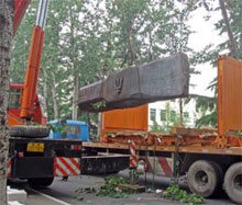 Der von der Firma Buderus-Edelstahl gesponserte und geschmiedete 30-Tonnen-Hammer reiste sechs Wochen lang per Schiff und zwei Wochen lang über Land, bevor er seinen neuen Bestimmungsort erreichte: den Campus der naturwissenschaftlich-technischen Universität in Peking.