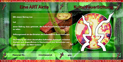 KulturFeuerStiftungDie KulturFeuerStiftung wurde im April 2009 von Andreas Rimkus ins Leben gerufen und fördert regionale und internationale Schmiedeprojekte für Kinder und Jugendliche. Sie öffnet Kindern das Tor zu einer anderen Welt; einer Welt, in der man mit bloßen Händen stahlhartes Eisen biegen kann. Einer Welt, in der keine Schulnoten zählen, sondern allein Kreativität, Geschick und Geduld. Mehr erfahren Sie auf der Website der Kulturfeuerstiftung: www.kulturfeuer.de P.S.: Stiftungsförderer können Sie durch den Erwerb einer ArtAktie werden ...
