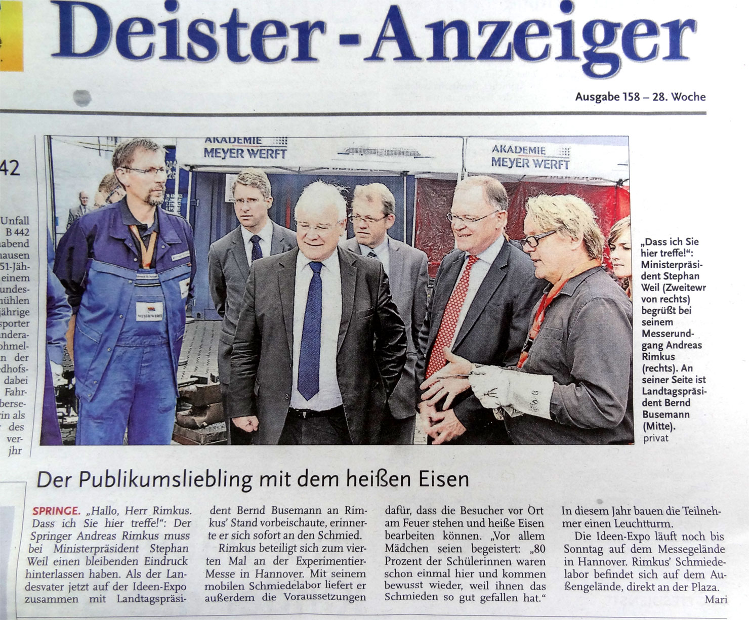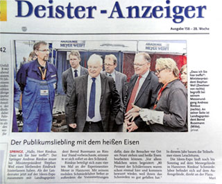 In Kooperation mit der Meyer Werft war das Mobile Schmiedelabor auf der Ideenexpo in Hannover vertreten. Auf dem Platz der Ideen ermöglicht es Kindern und Jugendlichen, die Kunst des Schmiedehandwerks zu erleben. An mehreren Feuerstellen schmiedeten sie kleine Teile eines Leuchtturms, die im Zusammenspiel mit dem Projekt „Elektroschweißen“ zu einem Leuchtturm zusammengesetzt werden sollten. Lesen Sie dazu diesen Artikel aus dem Deister Anzeiger.