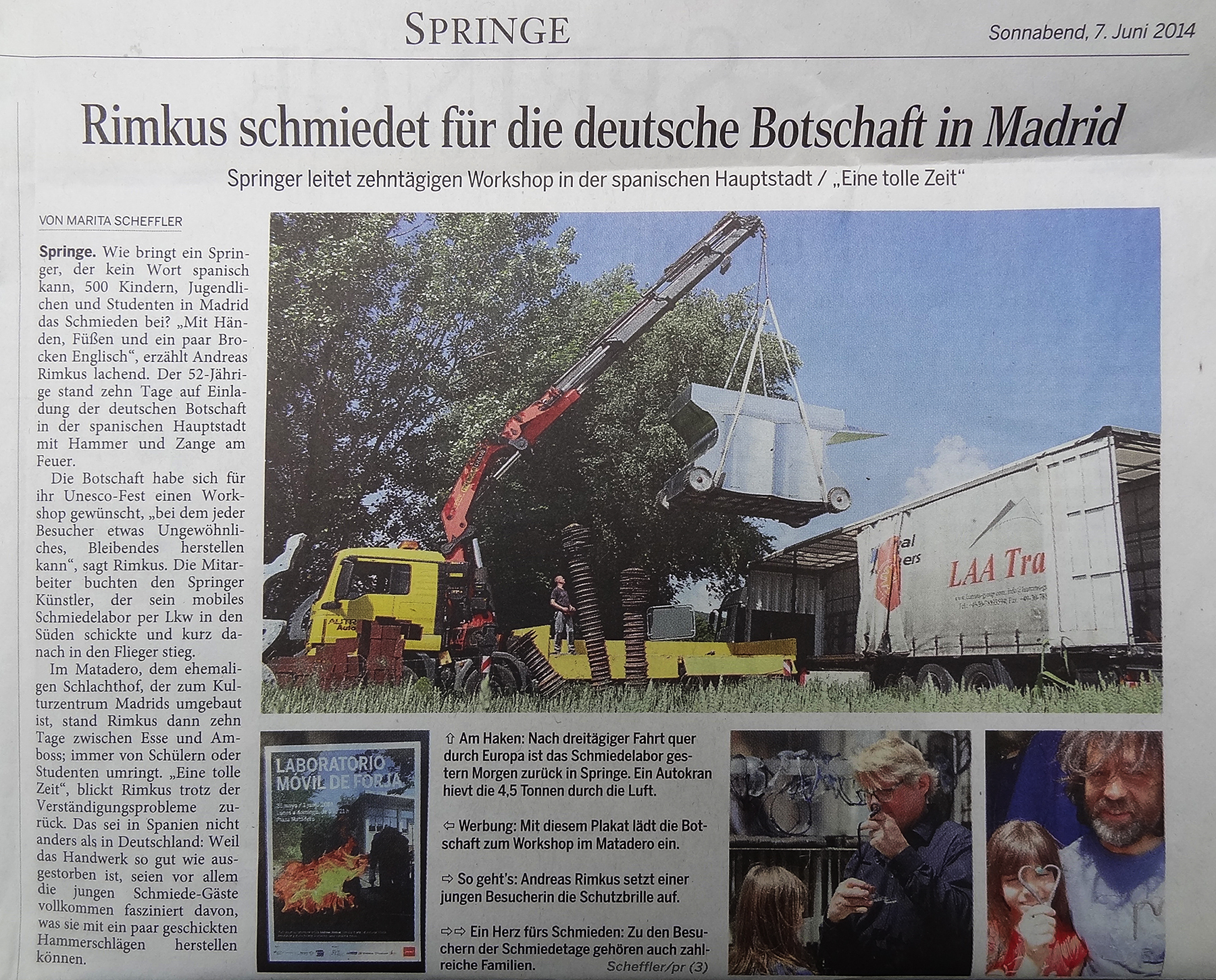 Die deutsche Botschaft in Madrid hatte sich für ihr UNESCO-Fest etwas Besonderes und Bleibendes für Ihre Gäste gewünscht. So folgte Andreas Rimkus mit dem Mobilen Schmiedelabor der Einladung nach Spanien und schmiedete erfüllte 10 Tage mit Schülern und Studenten im Matadero, dem zum Kulturzentrum umgebauten Schlachthof der spanischen Hauptstadt.