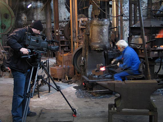 | Wilfried Krenzer schmiedet in seiner 125 Jahre alten Schmiede Wekzeug für seine elektrische Esse für das Mobile Schmiedelabor. Auch hier hat der Kameramann Marc Henze alles professionell gefilmt. |