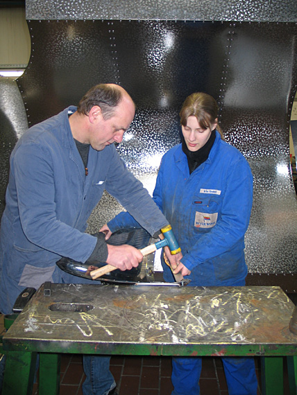 | Gerd Niklewski zeigt Iris Dalloff das Bördeln. |