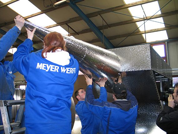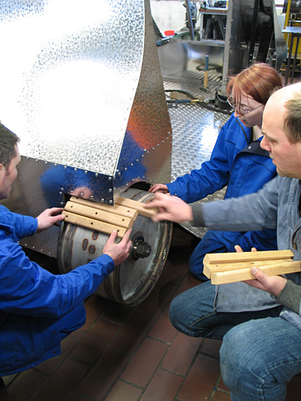 | Die Räder wurden von den Auszubildenden der Meyer-Werft gefertigt. Sie bekommen hier ihr Profil. |