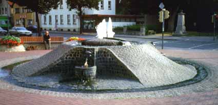 Fliessendes Wasser ist höchst lebendig. Deshalb soll es Spielgefährte sein für die Lebendigsten von uns: Die Kinder. Drei aus Messing und Kupfer geschmiedete Köpfe speien Wasser aus dem Mund, bis Kinderhände ihn schließen. Dann aus der Nase, bis Kinder sie zuhalten. Dann aus den Augen, bis Kinder sie bedecken. Dann spritzen sie aus den Ohren die lachenden Kinder naß. Der Brunnen liegt im Zentrum der Stadt Springe. Im Zentrum des Brunnens jedoch entspringen symbolisch die Quellen, denen die Stadt Namen und Wappen verdankt. |